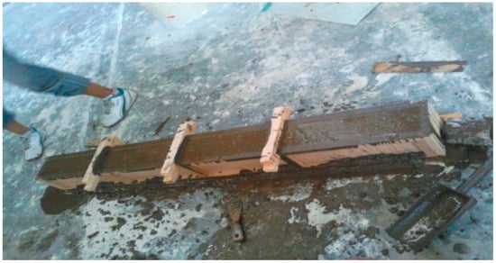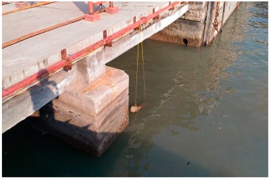 Two days after casting, the beams and their controlled cylinders were removed from their molding and then cured in the designated environment. Three beams and six cylinders were kept at room temperature of 35 °C for the first series while the other three beams and six cylinders (the second series) were sent to the Port of Tanjung Perak Surabaya and placed in a splashing zone to experience cycles of wetting and drying due to the tide cycles, see Figure 4. Unfortunately, one of the beams (B6) was lost during the curing in the seawater, and therefore for the second series, only two beams were available for the loading test. After 28 days, all the beams were taken back to the laboratory and then loaded until failure. For the second series, the specimens were first allowed to fully dry for 2 days before loaded to failure.