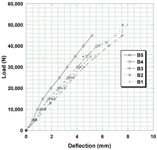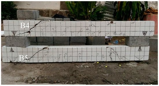 For the series I test, the cracking load was around 24%–47% of their ultimate load whereas for the series II test the cracking load was around 60%–65% of their ultimate load. However, due to the limited number of beams tested, it cannot be concluded that the sea environment increases the shear cracking load of geopolymer concrete. Further tests are needed to confirm this, despite some evidence to support this []. The shear strength of the GCB generally exceeded the predicted shear strength based on the ACI Code, except for specimen B4. The ultimate load of specimen B4 was only 82% of the ultimate load based on the ACI Code.