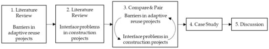 This paper is being carried out by the following five steps illustrated on Figure 2. First, an extensive literature review on adaptive reuse projects is conducted and a list of barriers in these projects are defined. Second, an extensive literature review on interface problems in construction projects is conducted. Third, interface problems that are found in the literature are compared and paired with defined barriers in adaptive reuse projects. Fourth, these paired adaptive reuse barriers and interface problems are explained on a case study. Last, how these problems can be solved and how interface management system usage can present a solution for improving the performance of adaptive reuse projects is discussed.