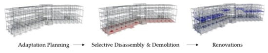 The potential benefits of adaptive reuse rely on the fact that it is possible to take away components from an obsolete building and then repair, reuse, remanufacture, or recycle them. In this matter, some of the most important green design methods include design for disassembly, design for maintainability and serviceability, design for reuse, design for remanufacturing, and design for recyclability []. For existing assets, complete designing for disassembly is not possible, and the process is reduced to planning for disassembly. Planning for disassembly plays an important role in the redevelopment design process where the selective deconstruction planning, as well as the deconstruction methods to recover components, have to be performed in an efficient way. The objectives are to reduce building costs of deconstruction activities and to increase the number of building component life cycles. If the disassembly planning is too complex or time-consuming, the associated economic and environmental costs could be higher than new construction. This field has been studied in the manufacturing industry since the last decade, concluding that disassembly planning can reduce the time and cost associated with disassembling products [].