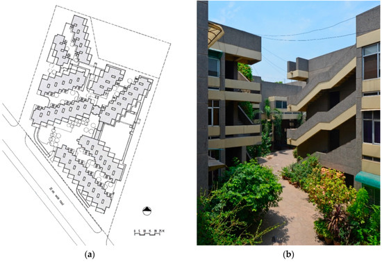 (a) Site Plan of Yamuna Apartments with housing blocks placed along four radially-converging streets [19]; (b) housing units overlooking the narrow pedestrian streets in Yamuna Apartments (Photo: Author).