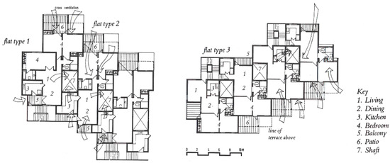 Floor plans of the three unit types with arrows depicting cross-ventilation [19].