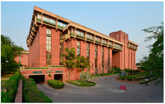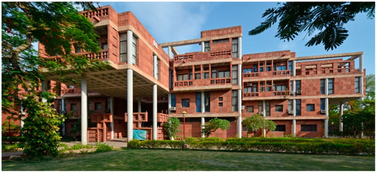 The CIET building is located on the southern edge of the 70-acre campus of the National Council of Educational Research and Training (NCERT, Figure 8). The various buildings situated within the campus have been designed by different architects and the only common feature between them is their height. Besides the CIET building, the other buildings in the NCERT campus do not have a strong architectural character as most of them are poor imitations of the exposed-concrete vertical slab buildings popularised in India by Le Corbusier through his Chandigarh Secretariat building. Therefore, instead of relating the design of the CIET building to buildings in the NCERT campus, Rewal chooses to respond to the national park and the historic Qutab Minar monument located on the south-west of the building. Framed views of the woodland and the distant Qutab Minar are provided from the upper level terraces [23]. Moreover, the use of red sandstone as primary cladding material is a common feature between the CIET building and the Qutab Minar.