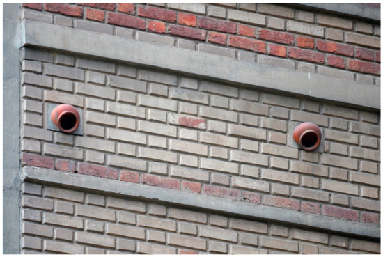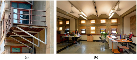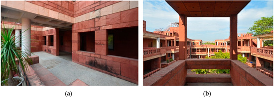 As Delhi lies in a climatic zone that is categorised as hot-and-dry for most part of the year, it is important to ensure that heat is delayed from reaching the interior of the building [25]. In the CIET building, Rewal has clad the exterior brick in-fill walls with sandstone thickening the external skin of the building and delaying the heat transfer into the building (Figure 10).