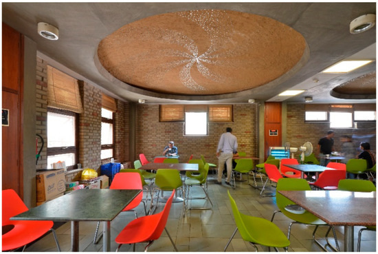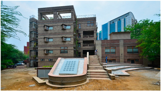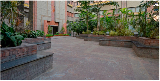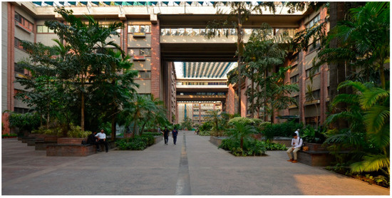 The courtyard in the CIET building not only acts as a climatological device but also acts as a focal point for communal interaction between the users of the building (Figure 12). The in-built steps in the courtyard invite users walking in the surrounding corridors to gather and sit in the courtyard [21] (p. 176). In addition to the courtyard, Rewal has provided roof terraces on the uppermost level. Traditionally, roof terraces in India have been used for outdoor sleeping on hot summer nights. In the CIET building, roof terraces have been provided for enjoying the mild summer evening breeze with views of the surrounding national park and the distant Qutab Minar [26]. The roof terraces serve an additional purpose as they allow users to enjoy the winter sun.