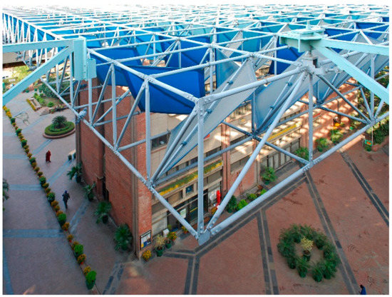 The built forms in the Dilli Haat have been clad in stone that delays heat from reaching the interiors due to its thickness and thermal mass [39]. The craft shops are covered with canopies of translucent tensile membrane allowing toned daylight into the shops. Floating above the circular walls of the craft shops, these canopies also enhance the air circulation within. The large overhang of the tensile canopies shades the craft shops against harsh sun, while the ceiling fans installed underneath the canopies further improve the thermal comfort in the shops (Figure 34).