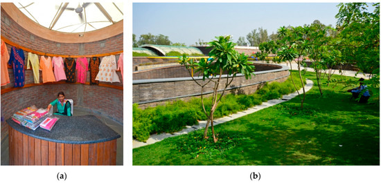 (a) Tensile canopies with ceiling fans cover the craft shops; (b) large usable green roofs above air-conditioned shops (Photos: Author).