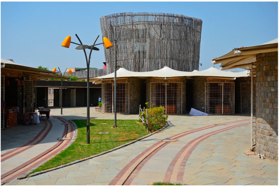 The informal zone of the Dilli Haat, consisting of 100 craft shops, interprets the traditional spatial arrangement of Indian bazaars (Figure 33). Craft shops are arranged in clusters of 5–6 shops and these clusters are further composed in an organic layout to form a bazaar. Paved allies meander along the craft shop clusters and small green patches lending an intimate character to this zone (Figure 37). However, having to accommodate a wide range of functions mandated by the elaborate design brief of the project, the overall design of Dilli Haat ends up diluting the spirit of a crafts bazaar [38].