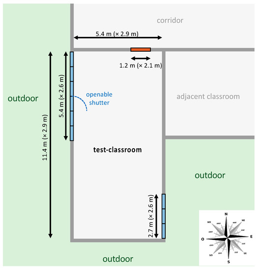 The test-classroom investigated is an 11.4 m × 5.4 m × 2.9 m naturally-ventilated room (floor surface 61.6 m2, volume 178.5 m3) of a primary school placed in Cassino (Central Italy) and built in the 1980s (Figure 1). The school (two-story building) is located in the urban area of the city. The test-classroom is placed at ground floor and it is roofed by a terrace. It has two single-glazed aluminum inward opening doors on the longest walls of the classroom: one (2.7 × 2.6 m) facing east and the other one (5.4 × 2.6 m) facing west. The east wall of the test-classroom is partly adjacent to another (heated) classroom, the west and south walls face outdoors, whereas the south wall faces the main corridor of the school (Figure 2).