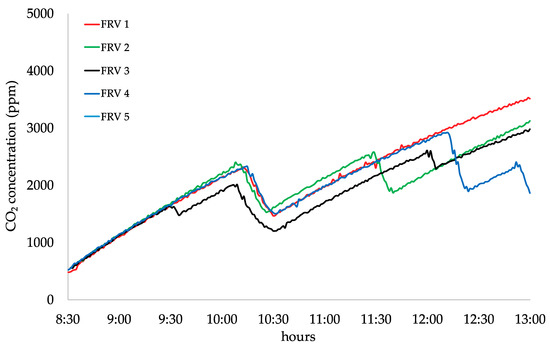 CO2 trends measured during the free-running ventilation tests (crowding index of about 2.2 m2 person−1).