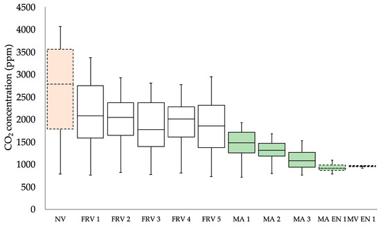 Box-plot of CO2 concentrations measured/estimated for the different ventilation scenarios for the same crowding index (2.2 m2 person−1). Dashed boxes represent estimated values, whereas solid boxes are used for measured values.