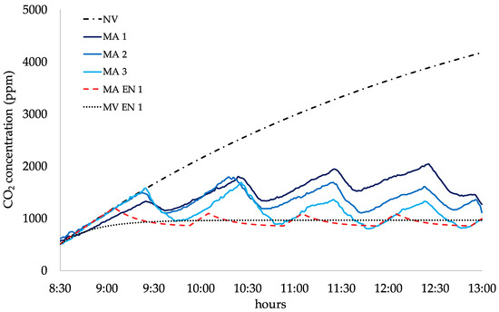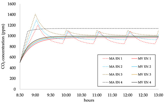 The crowding index effect was analyzed considering the following ventilation scenarios: (a) manual airing required by the EN 15251 (MA EN 2 to MA EN 4 of Table 2), and (b) constant air volume mechanical ventilation required by the EN 15251 (MV EN 2 to MV EN 4 of Table 2). CO2 trends were calculated on the basis of a CO2 mass balance equation for both the ventilation scenarios considering the simulation hypotheses described in Section 2.3. In particular, a higher number of occupants leads to higher required ventilation rates as suggested by the EN 15251 standard [19] (method based on ventilation rate per person). Indeed, required air exchange rates of 3.00, 3.24, 3.57 h−1 are needed for 2.0 (tests MA EN 2 and MV EN 2), 1.8 (tests MA EN 3 and MV EN 3), and 1.6 m2 person−1 (tests MA EN 4 and MV EN 4) crowding indexes, respectively. The simulations of the CO2 trends corresponding to the mechanical ventilation scenarios were performed just adopting the abovementioned constant air exchange rates for the entire school period. On the contrary, the CO2 trends corresponding to the manual airing scenarios were performed applying Equation (1) (i.e., weighted average of the air exchange rates typical of window close and open configurations). Once again, the opening procedures were performed between two consecutive class hours.