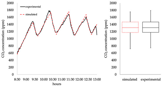 Comparison between the CO2 concentration (trends and box-plots) measured (experimental) and simulated through the mass balance equation for the manual airing test with scheduled window openings of 15 min every hour (MA 2)