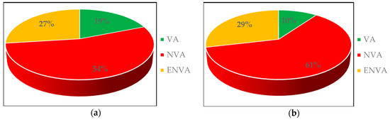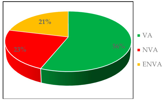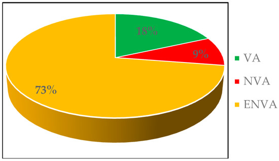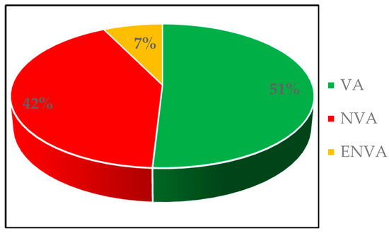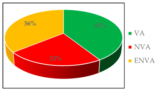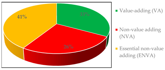Some variations can be found in the percentages of VA, NVA, and ENVA when comparing the results from observations made in Astana with those available in literature. For instance, a study conducted by Jens and Kristensson [34] found 44% VA activities in construction process, while the percentages of NVA and ENVA accounted for 36% and 20%, respectively. On the other hand, Mossman [35] assessed that the volume of NVA activities were in the range of 55%–65%. VA accounted for only 5%–10%, while the remaining 30%–35% were ENVA activities. Comparing the observed results in Astana and the conducted survey results, similarities can be noticed.