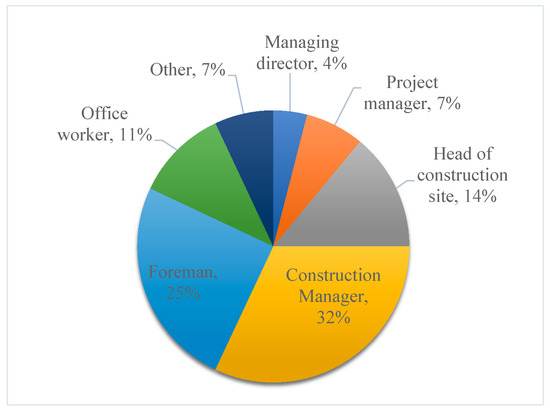 Figure 7 shows the distribution of the work departments of the respondents, which shows that a wide range of construction professionals, including managing directors, project managers, heads of construction sites, site engineers, surveyors, foremen, and others, answered the survey questions. The majority of the participants were involved in the field of construction and were aware of wasteful activities in the construction process. Moreover, the working experiences of most of the participants were found to be from 1 year to more than 10 years. Therefore, the obtained survey results can be considered as representative.