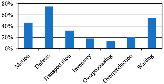 The next question on the survey was about the types of wasteful activities that are common within the construction operation. In this case, the participants were asked to choose from the seven types of wasteful activities (without considering their frequency of occurrence) as they observed in their construction projects. As can be seen in Figure 10, 75% of the participants indicated defects or correction waste as the most frequent, followed by waiting time, motion waste, transportation waste, and others.