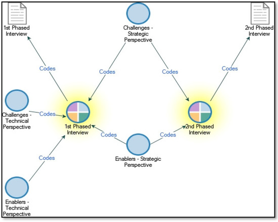 A thematic analysis is conducted to identify patterns and themes in the collected qualitative data by coding the inputs recorded in the semi-structured interview sessions. The thematic analysis begins at the stage of the data collection and data entry, and continues throughout the coding and interpreting of the data [67]. The themes are determined as technical level challenges, strategic level challenges, technical level enablers, and strategic level enablers. The themes are coded by the data aggregated from the first-phased and second-phased interview questions. A qualitative data analysis software package, NVivo, is used to perform the coding process shown in Figure 1. As can be seen in Table 3 and Table 4, there are several common questions provided in both interview question sets to observe saturation regarding certain challenges and enablers perceived by the interviewees with different roles. These saturation points are related to the nodes of strategic perspective.
