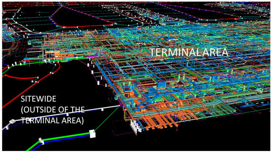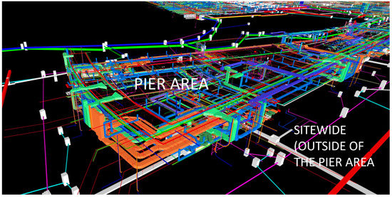 An airport project, due to its nature, requires very different and complex types of mechanical systems that need large areas to be placed and to be activated together. Figure 2 and Figure 3 are viewpoints, which focus on the terminal and pier building regions respectively, are taken from the merged model of the airport landside and airside MEP and the infrastructure cross-coordinated model elements (listed in Table 1). They depict the significant challenge of the project’s engineering complexity; the clusters of various types of MEP elements (e.g., HVAC ducting, plumbing pipes, fire sprinklers, electrical and IT cable trays, and heating and cooling pipes) shown at all of the levels of the terminal building and pier building areas, and the underground network infrastructure (e.g., electrical duct bank, drainage, and waste water) distributed over the sitewide region, require iterative coordination and modeling for the on-site shop drawing production and manufacturing. Furthermore, because of dramatic space constraints, the virtual coordination became significantly challenging, and continuous input from the INA site engineers was required before synchronizing the coordinated model on the cloud and sharing it with all of the project parties.