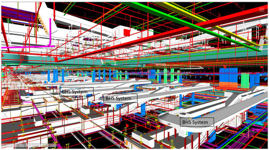 BHS design coordination and placement on the site were significant engineering challenges in the INA Project due to the requisite accuracy and the length (42 km) of the baggage routing. Initial coordination decisions regarding the placement of the MEP systems, including the HVAC ducting, piping, and the electrical and IT cable trays within the architectural and structural envelope, were made according to the BHS systems’ placement. Figure 4 provides a closer look of the BHS systems in the terminal building area, and articulates the cross-coordination complexity within a highly congested area. The BHS systems, and the MEP systems in the surrounding areas, are highlighted in Figure 4.