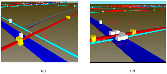 Clashes between the AGL, pipe and culvert models. (a) Clash between the AGL and pipe models; (b) Clash between the AGL and culvert models. Red: AGL, Cyan: Pipe, Dark Blue: Culvert.