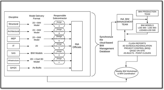 Achieving cultural change in complex projects is a process full of struggles. The incompatibility of the site work with the BIM model is one of the most crucial problems, because it has been known that the issues detected in relation to discrepancies between the coordinated BIM model and already manufactured zones on the sites have the potential to cause future coordination problems, waste and cost over-runs. Accordingly, it is also assessed that monitoring and controlling work on the site is one of the major challenges from a technical perspective. As far as the size and complexity of the project is concerned, managing all project individuals, mainly the subcontractors, becomes a very challenging issue that requires a comprehensive management plan [44]. In the very beginning of the project, a lack of awareness and experience of subcontractors and their resilient attitudes against engaging with BIM processes in their daily site and office work triggered the necessity for BIM training for all subcontractors through facilitated workshops. Not only the INA project case, but also the LHR T5 Project and DEN expansion project cases bear similarities in terms of an unsupportive organizational culture that was brought on by various project parties who had no or little experience with BIM technology and processes. It is stated that all parties brought their own practices that conflicted with the policies regarding 3D CAD uses, creating the greatest challenge in terms of getting people to actually implement 3D CAD as it is standardized by the owner [28]. Another study articulates another challenge of physical space constraint preventing co-location, and consequently preventing the full integration of the information flow during the design and construction [66]. Similarly, DEN mostly tackled the problem of reaching a consensus on collaboration in the BIM environment [70].