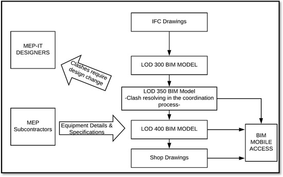 Discipline-wise and zone-wise, clash detection is utilized throughout the design and construction phases. The frequency of generating clash detection reports depends upon the frequency of the design revisions. The periodicity of the clash detection is determined by the submission schedule of the subcontractors. However, the BIM department determines and controls the coordination process of the mechanical, electrical, plumbing and information technologies (MEP-IT) systems with a separate coordination workflow, as they require more of a coordination effort due to their highly complex nature within such a mega airport context (Figure 9). The workflow depicts the concurrent engineering and design in a fast track fashion, as well as the responsible parties in this process. The main objective is to resolve the clashes at the LOD 350 BIM level with the MEP designers and proceed to the extraction of the shop drawings out of the clash-free BIM model to push the work on the site [44]. The BIM models are continuously developed by the addition of various details, such as equipment details and specifications throughout the workflow. Every update of the BIM models and shop-drawings are shared on the cloud and made accessible via mobile tablets on the site.