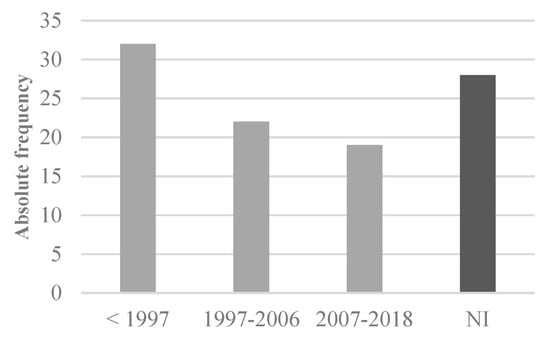Figure 1, of the 101 VLF inspected, approximately one third was over 20 years, one third was in the remaining age gaps, and the other third did not have information on the construction year (NI). The oldest VLF inspected, of those with a known age, was 32 years old. That flooring was quite worn due to consecutive waxing and stripping. However, it did not show anomalies other than wear, scratching, and welding joints between tiles requiring replacement. According to Gorrée et al. [