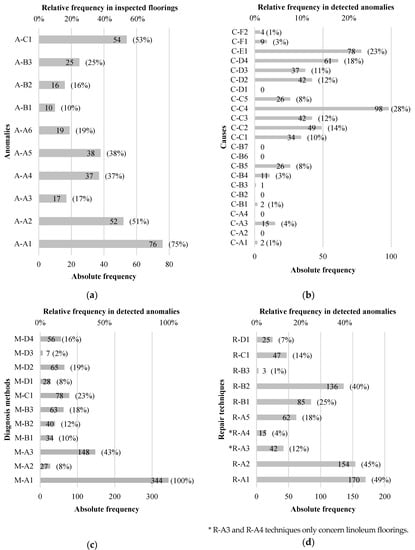 A total of 344 anomalies were detected in the inspected floorings, resulting in an average of 3.4 anomalies per flooring. As for the probable causes, 537 were recorded, resulting in an average of approximately 1.6 causes per anomaly. As to diagnosis methods and repair techniques, a total of 898 and 739, respectively, were recommended, which results in an approximate average of 2.6 diagnosis methods and 2.1 repair techniques per anomaly. The absolute and relative frequencies of detected anomalies were analyzed (