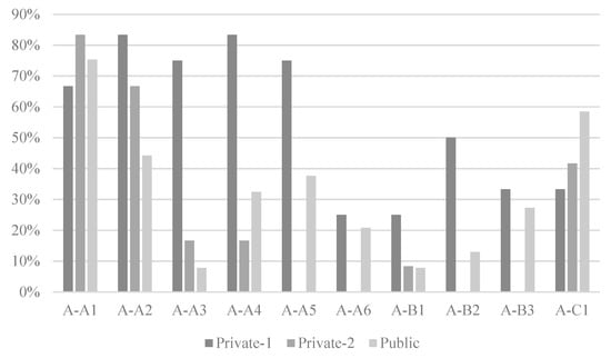 As mentioned, out of the six inspected health infrastructures, two were private and four were public, resulting in 24 and 77 analyzed floorings, respectively. Thus, a comparison between anomalies in private and public infrastructures was made. First of all, a significant age difference was noted, as all VLF inspected in Private-1 were more than 20 years old, while those in Private-2 were up to 10 years old. The frequency of anomalies in Private-1 (12 cases), Private-2 (12 cases), and the inspected Public sector facilities (77 cases) is shown in