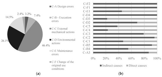 Figure 6, the distribution of causes in direct and indirect causes is shown, not considering causes with two occurrences or less. The causes most often identified as direct were “C-D3 presence of moisture” (78%) and “C-C4 dragging of equipment” (77%). On the other hand, the causes most frequently identified as indirect (in this case, with a frequency of 100%) were “C-D4 natural ageing”, “C-F1 excessive loads”, and “C-F2 changing the use of space”.