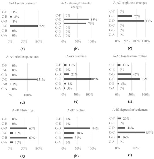 Finally, anomaly “A-C1 faulty welding joints” was influenced by all groups of causes, although group “C-F change of the original use conditions” was only identified once. It is an expected result, as joints can easily be degraded if incorrectly designed, executed, submitted to mechanical actions and aggressive agents, or poorly maintained. A similar variety of types of causes may be verified in wood floorings’ [