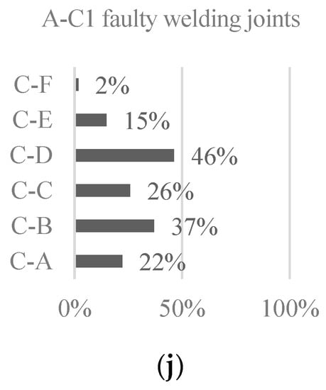 Finally, anomaly “A-C1 faulty welding joints” was mostly associated with method “M-A1 visual inspection”, but “M-A3 crack ruler” (26%) may also play an important role in determining the size of the joint and of any detected cracks in its welding.