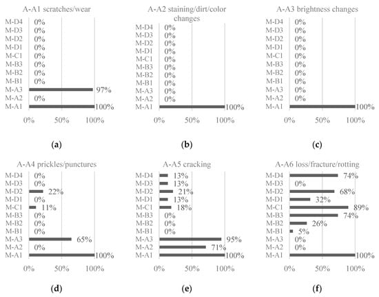 Figure 8. Anomaly “A-A1 scratches/wear” was only associated with methods “M-A1 visual inspection” (100%) and “M-A3 crack ruler” (97%), as expected. By measuring the thickness of the scratch, one can more easily diagnose the probable cause of the anomaly. While dragging of equipment generally causes a finer scratch, the movement of inadequate cart wheels leaves a thicker scratch. Anomalies “A-A2 staining/dirt/color changes”, and “A-A3 brightness changes” were exclusively associated with method M-A1.