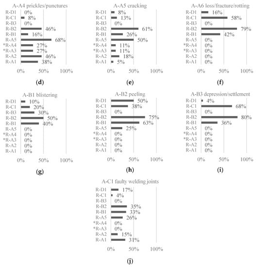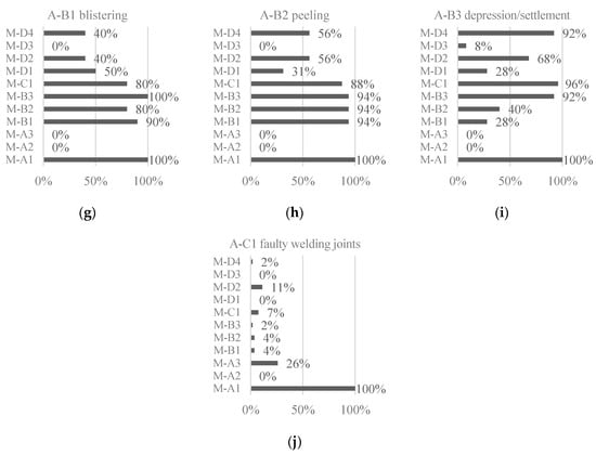 Finally, anomaly “A-C1 faulty welding joints” may be repaired by all techniques except R-A3, R-A4, and R-B3. The most commonly recommended techniques were “R-A1 cleaning the cladding” (31%), “R-A5 application of welding” (26%), “R-B1 total replacement of the flooring” (33%), and “R-B2 partial replacement of the flooring” (35%).