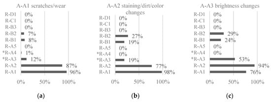 Anomaly “A-A1 scratches/wear” should be repaired by “R-A1 cleaning the cladding” (96%) and “R-A2 applying a surface protector” (87%), to reduce its aesthetic impact by smoothing the surface. As stripping (R-A3) is exclusively used in linoleum floorings, it has a small incidence in the sample (12%), since, in the inspection campaign, only 13 of 101 analyzed floorings were linoleum. When A-A1 occurs, partial (R-B2) or total replacement (R-B1) only should take place when the area has a high aesthetic value, hence these techniques were only scarcely recommended in this context.