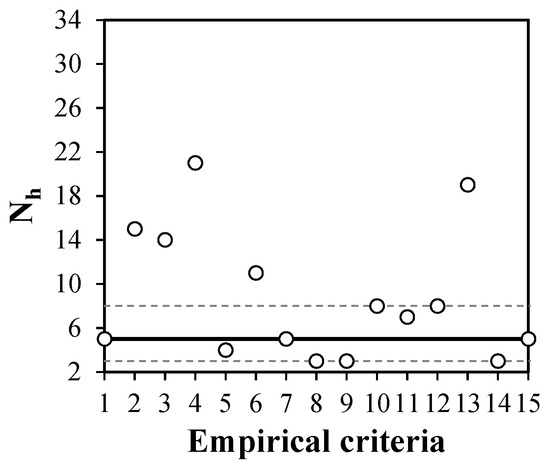 It has been shown in many damage identification studies that the application of one hidden layer is adequate for accurate prediction [27,28]. The number of hidden layers was determined by the analysis of empirical criteria (Table 4) according to the suggestions from different authors [29,30] based on the number of input data Ni and number of outputs (in this study No = 1, neural networks processing was done always with only one output). As is visible in Figure 1, the most frequent values are three, five and eight neurons. Accordingly, further analysis was done with those three suggestions in order to obtain the best results with neural network processing.