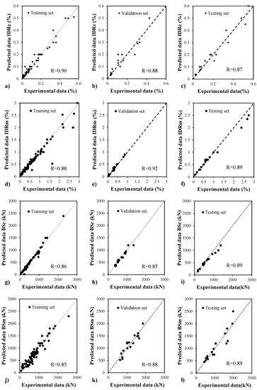 Results of neural network processing for 5 hidden neurons.(a) for IDRc training set; (b) for IDRc validation set; (c) for IDRc testing set; (d) for IDRm training set; (e) for IDRm validation set; (f) for IDRm testing set; (g) for BSc training set; (h) for BSc validation set; (i) for BSc testing set; (j) for BSm training set; (k) for BSm validation set; (l) for BSm testing set.