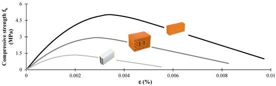 The masonry infill type is defined according to compressive strength values. In order to define the basic material properties of the masonry infill (compressive strength of the masonry and the stress-strain relation in compression), verified recommendations are used for determining the compressive strength of masonry infill based on the masonry and mortar strength according to Hendry and Malek [35] presented in Equation (2):