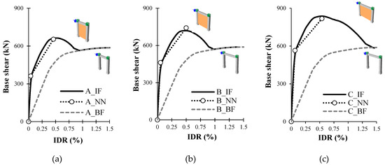 Capacity curves of RC infilled frames A (a), B (b) and C (c) with and without masonry infill in comparison with NN results.