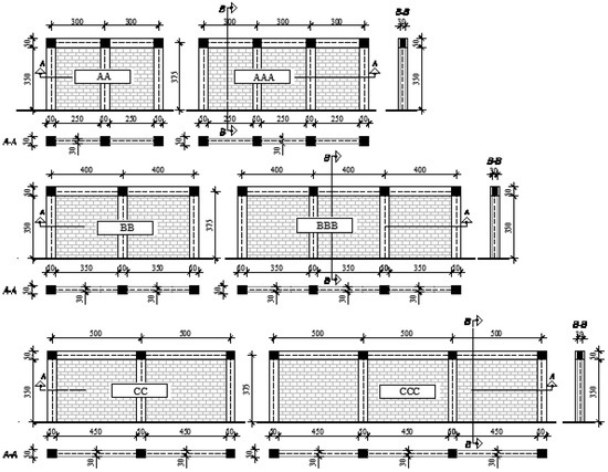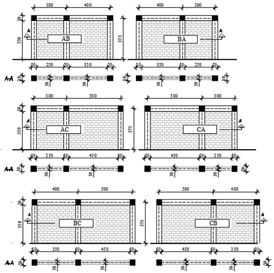 Reinforced concrete frames with height of 375 m has different bay length (A frame–3 m, B frame –4 m, C frame–5 m). Cross-section dimensions are kept constant for all three bay lengths, columns with 50 × 50 cm, and beams with 30 × 50 cm. The RC frames are designed according to seismic regulations [34]. Therefore, material properties for concrete members are based on concrete class C30/37 with reinforcement B500, with reinforcement ratio of 2% of the cross sections. Pushover analysis was carried out in order to evaluate the capacity of infilled frames.