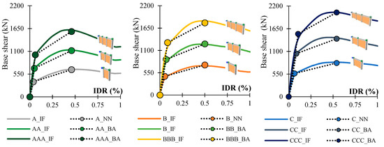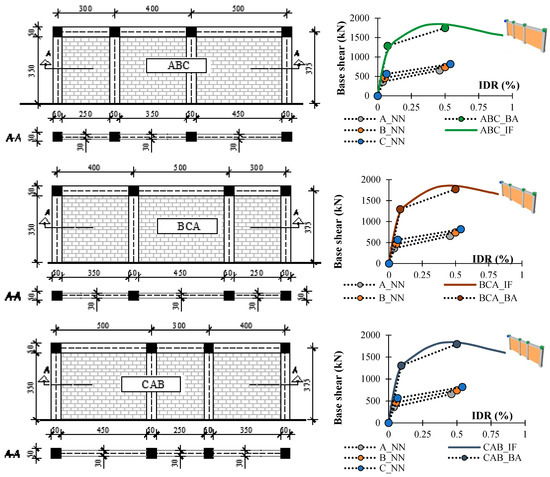 Multi-bay frames with equal bays (Figure 6) are obtained by adding one (AA, BB, CC) or two (AAA, BBB, CCC) additional equal ranges to the initial frame (A, B, C). For each of the models, results from nonlinear analysis are obtained by pushover method in Seismostruct 2018 [32] and are shown in the following pictures and tables.