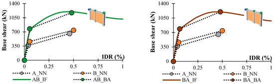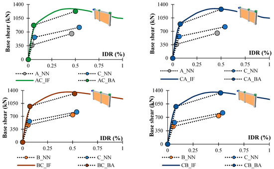 In Figure 10, the results for two-bay frames with combinations of A, B and C frames of different bays are shown. The curve shows the results from nonlinear FEM modelling of the two bay frames, while the bilinear curves show the initial results obtained by neural networks (ANN, BNN), and bilinear curves of approximating Equations (7)–(10), which are compared with the results of the nonlinear analysis (Table 10).