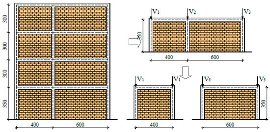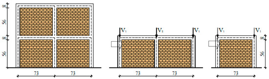 In order to determine the applicability of the neural networks trained on the experimental database of masonry infilled frames, the evaluation of the expressions for multi-bay frames of different and the same lengths on multi-bay structures was performed. As neural networks emerged as a result of single-storey and single-bay frames, approximation models were developed. It is based on the assumption that masses and loads from all floors can be transferred to the columns of the ground floor. In multi-bay models, each of the bays is taken as a one-bay frame (Figure 12, Figure 13 and Figure 14). Definition of the vertical forces that act on columns for input data in neural networks processing are determined according to the boundary conditions and the assumption that both forces are mutually equivalent.