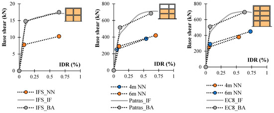 The same principle was used for Patras and EC8 buildings. Obtained results are presented in Figure 15 and Table 14. It can be concluded that proposed bilinear Equations (7)–(10) can be used for both uniformly and non-uniformly distributed infilled frames. For the Patras frame, MRE was 8% and for EC8 frame error was 7%.