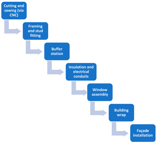 Currently, many companies utilise and adopt conventional manual-based construction techniques for timber-based prefabricated manufacturing [1]. However, timber-based prefabricated panels are an increasingly utilised system in the construction industry and with it, the automated technologies which support them are currently being strongly developed and adopted in replacement of conventional methods [2,3,4,5,6,7,8,9,10]. The manufacturing of prefabricated timber panel walls is an increasingly developing field, where a combination of automated and manual processes are utilised to assemble an efficient production line [11,12]. Recently, there has been an increasing trend in the construction of timber structures [13]. Due to this, it is essential that manufacturing processes are able to withstand the increase in demand whilst still satisfying the relevant standards and expected quality assurances. The fully-complete prefabricated timber panelised wall systems industry is significantly behind the level of automation in other industries, particularly in comparison to the automotive industry [14]. Thus, significantly more work is required in the understanding and development of automated technologies for the timber industry at a building scale [15]. The construction of timber-based fully prefabricated panelised walls includes a variety of different segments assembled through numerous stations along a production line [16,17,18,19,20]. Each station is responsible for a specific function and role such as cutting and sawing, gluing and pressing or façade installation [21]. The respective manufacturing plants are large in nature and located off site, close to transportation routes and have easy access for movement of materials into the factory and finished products out to the site [13,22]. The assembly lines of many facilities involve, or are even based upon, carefully controlled manual labour-based tasks. Since many processes in manufacturing of panelised walls is repetitive, machines are well-equipped to efficiently and accurately process a high capacity of materials [23]. Therefore, this can potentially increase the production capacity, reduce production time and increase the accuracy and quality throughout the assembly line [24,25]. Furthermore, in the accuracy of conventional cutting and sawing of the timber panels, there is a higher chance of human error, as tedious tasks such as measuring and cutting a piece of wood exactly is comparatively unreliable when conducted by humans. Automated machines refer to computer-aided design software, which specifies the exact dimensions to cut and assemble the materials. Because of this, a seamless and controllable process, without any interruptions, can be formed and customised without the risk of human error in manufacturing [26,27]. In addition to this, advanced automated machines can, not only reduce the amount of labour needed, but also the training required as workers can oversee machines rather than operate them [20,24,28]. As a result, this may decrease the reliance of construction companies on skilled labour and provide a solution to the current shortage in construction workers in the manufacturing field [29,30].