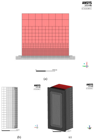 A CAD model was generated with the exact geometrical dimensions as those presented in the experiment by Elbakheit [4] (Figure 1). The model was then imported into ANSYS CFD Fluent 2019R1 software (ANSYS, Inc. Southpointe, PA, USA). A structured mesh was produced (Figure 2) to simulate the buoyancy flow. This was achieved by employing the standard k-ε module with the full buoyancy effect option. The mesh was refined at the back of the PV panel with inflation layers to capture the heat transfer to the air inside the duct. A heat flux of 375 W/m2 was assigned to the PV panel together with a laminar module, followed by the turbulent model. The radiation model with surface-to-surface option was also activated.