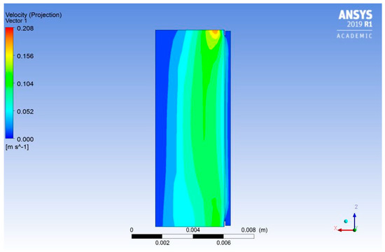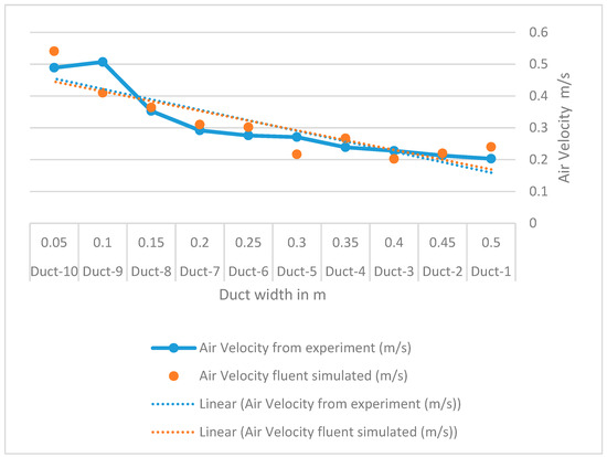 When simulating all 10 duct widths shown in the referenced experiment, agreement was found between the simulated and practically measured values of buoyancy-induced air velocities in the duct. This was evidently indicated by the linear trend line reported in Figure 3. Here, both simulated and experimental results indicated that the highest resulting air velocity owing to buoyancy was approximately 0.5 m/s for a duct width of 5 cm. This velocity was gradually and linearly reduced to approximately 0.2 m/s in the largest duct width of 50 cm.