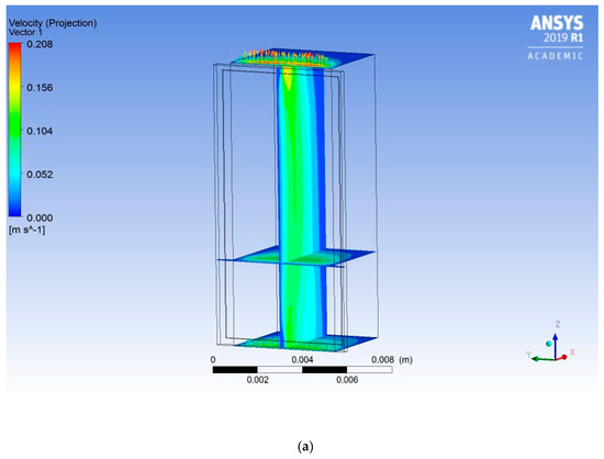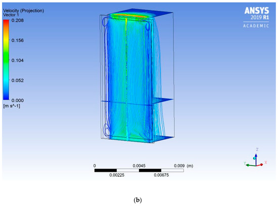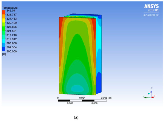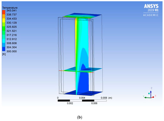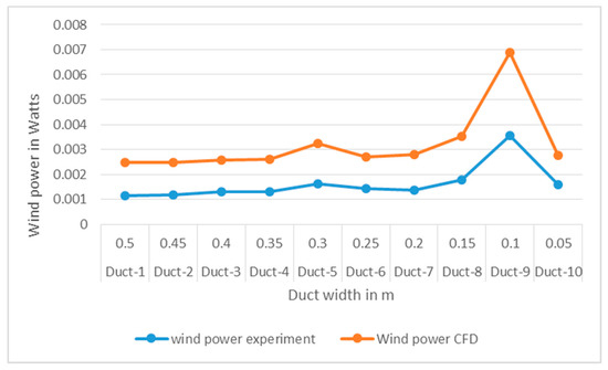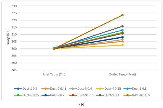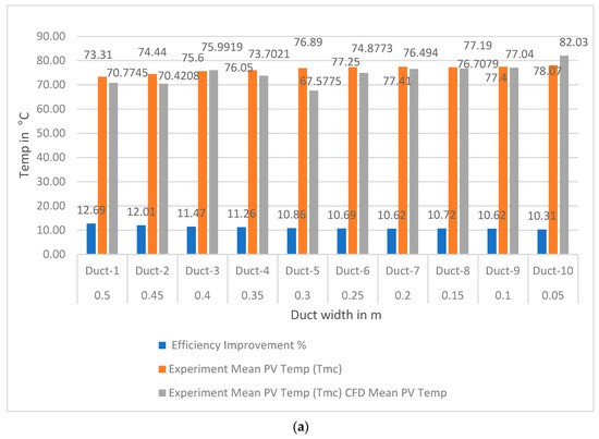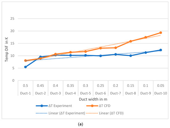 However, the simulated temperatures were slightly higher than the experimentally recorded temperatures, as revealed in Figure 6a,b, especially for low duct widths. This result was also evident for the computed temperature difference between the inlets and outlets of the different duct widths. We found that the experimental results were lower than the CFD-simulated results.