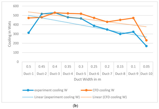 Figure 6b shows a comparison of the cooling effect in watts by the experimental and simulated ducted system. Both trend lines exhibited higher cooling for larger duct widths than that for lower duct widths. However, the influence of changes in temperature pointed out above affected the cooling yield by making the simulated CFD have higher cooling than the experimental results at low aspect ratio ducts (i.e., ducts of 0.05, 0.10, and 0.15 m).