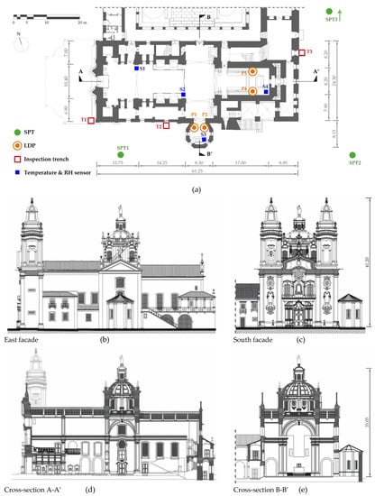 Architectural definition of the church of São Miguel de Refojos: (a) ground floor plan, (b) longitudinal elevation, (c) front elevation, (d) longitudinal cross-section, (e) transversal cross-section. Dimensions in m.